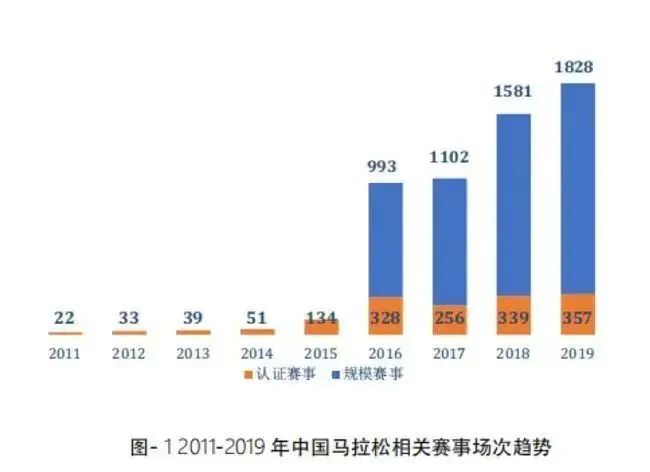 據中國田徑協會數據顯示,在2011年至2019年間,全國馬拉松參賽人數由40萬人次升至712.56萬人次,賽事場次更是出現井噴,僅2019年全國舉行的公路長跑賽事就多達1828場,甚至同一天有43場馬拉松賽事在不同城市進行。