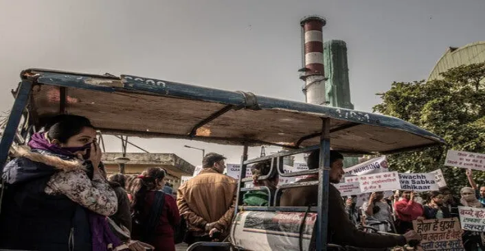 2019年,與蒂馬爾普爾-奧克拉(Timarpur-Okhla)垃圾焚燒發電廠僅一牆之隔的蘇赫德夫維哈爾(Sukhdev Vihar)社區居民舉行抗議活動。圖源:《紐約時報》