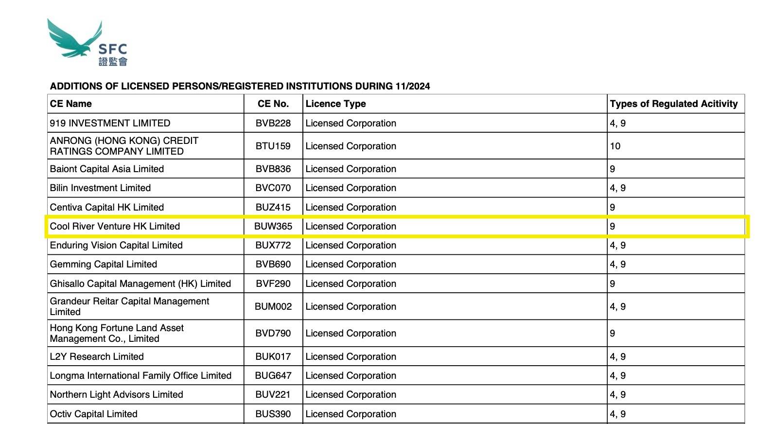 根據香港證監會網站的公告,Cool River Venture HK Limited公司在2024年11月獲得了獲得香港證監會頒發的9號牌,即資產管理牌照,獲頒牌照後,公司可在香港開展資管服務業務。