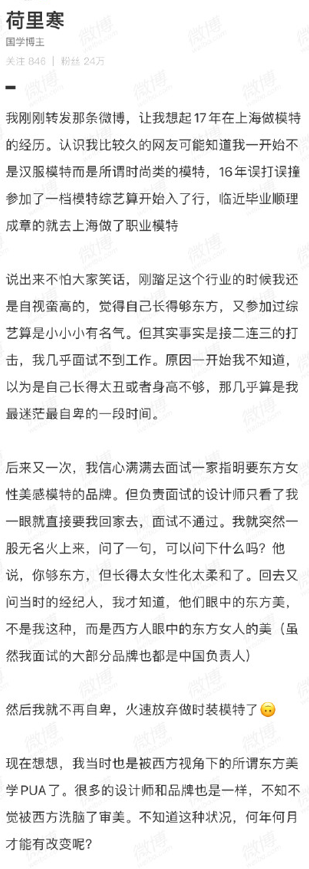 一箇中國女模特@荷裏寒就講述了自己的經歷,因為自己的長相,她長時間找不到工作,被各大模特公司和品牌接二連三的拒絕,想拍一個廣告維持生活都做不到,最後只能被迫放棄做時裝模特的夢想。