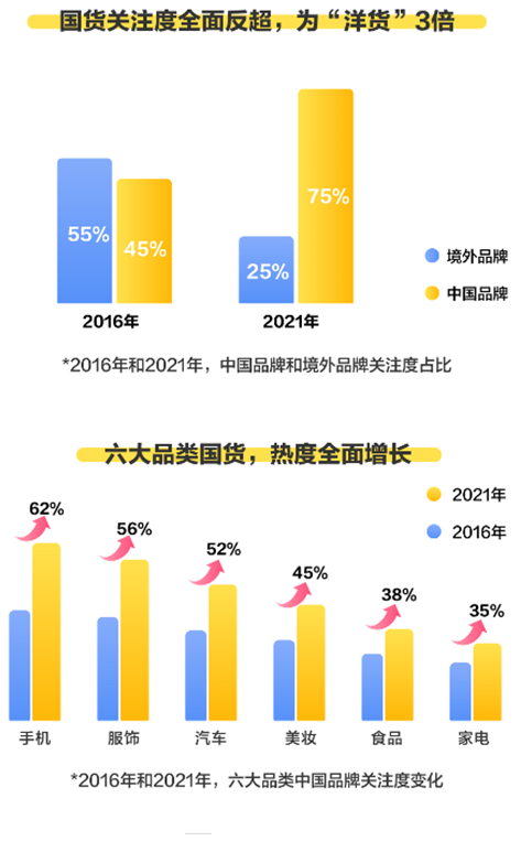 從整體來看,2021年中國人對國貨的關注度,已經達到了國外品牌的3倍。