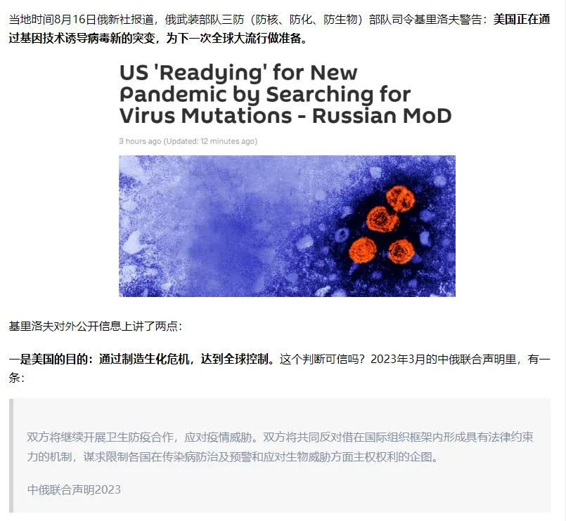 俄羅斯主要是因為俄烏戰爭的原因,自己也有生物武器,同時在烏克蘭掌握了一些美國設立的實驗室數據,所以一直比較活躍,俄軍方認為,2027年是時間點。