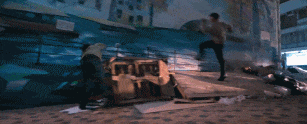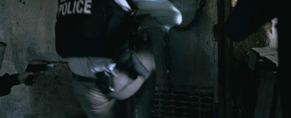 在電影裏面有一場跳上牆跑酷,並翻身跳在犯人面前的武打鏡頭。