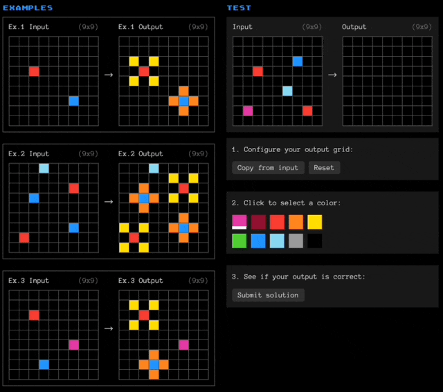 簡單介紹一下ARC-AGI數據集,題目帶有色塊的網格陣列(以文本形式表述,用數字代表顏色),大模型需要觀察每道題目中3個輸入-輸出示例,然後根據規律填充新的空白網格。