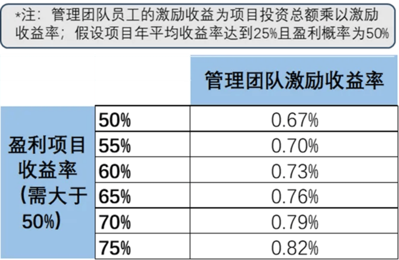 基於該薪酬制度用於吸引並留住人才的初衷,該制度在基金管理團隊所投項目收益率達到行業平均水平時即可為員工提供獎勵,能在原有薪酬體系上加碼,增加對員工的吸引力。且當項目實現的收益更高,員工所獲得的薪酬激勵收益亦越高,收益與業績掛鈎可提高員工對工作的積極性。在吸引人才及促進工作積極性兩個維度上,相關制度的設立能起到正向促進的作用。