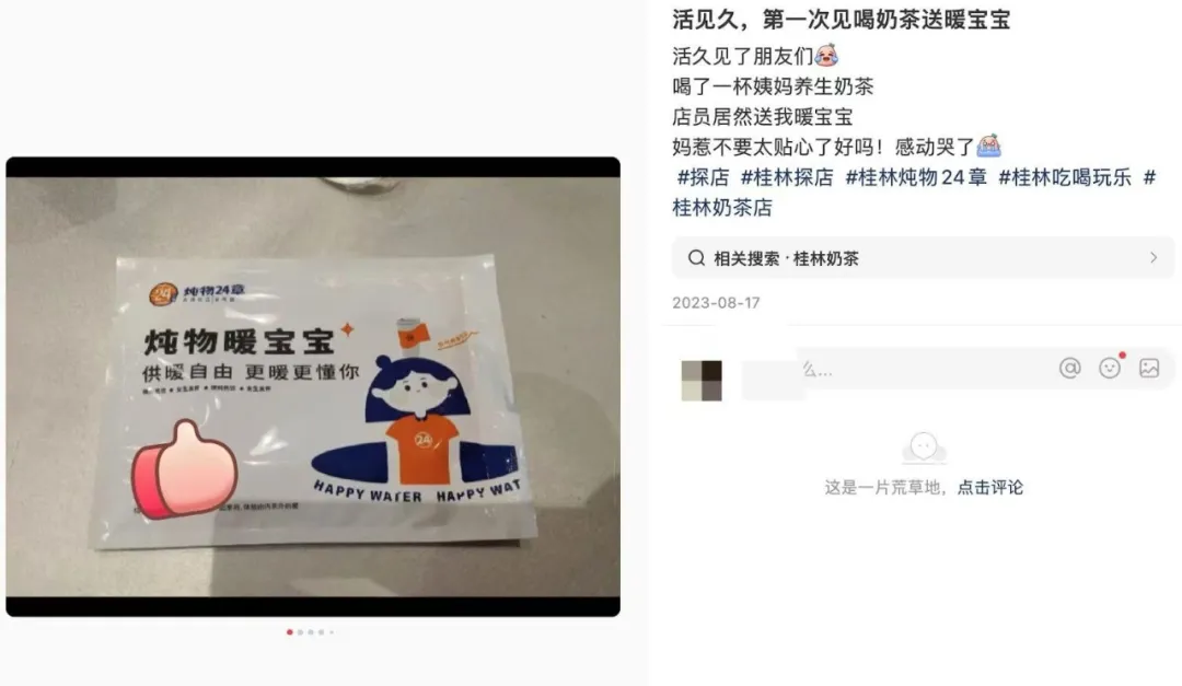 更讓人想不到的是,燉物24章的熱飲外賣杯還貼了暖寶寶,網友説飲品拿到手時很燙,“暖胃更暖心”。
