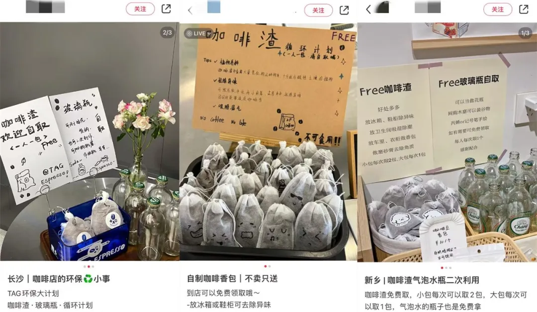 長沙的泰閣咖啡會在店內準備咖啡渣包、氣泡水玻璃瓶,供顧客免費限量領取,咖啡渣包可用來吸濕除味,玻璃瓶可以插花或進行二創。
