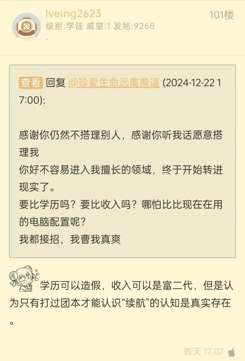 隨着另一名ID為“珍愛生命遠離撕逼”(以下簡稱為珍愛生命)的用户加入戰局,樓裏的火藥味也愈加濃烈起來。珍愛生命明顯不再願意像樓裏其他網友那樣“慣”着lveing,他開始翻lveing的舊賬,查他的副本進度,試圖以此來證明lveing魔獸玩兒得很菜,打擊他在這個話題上的發言權。