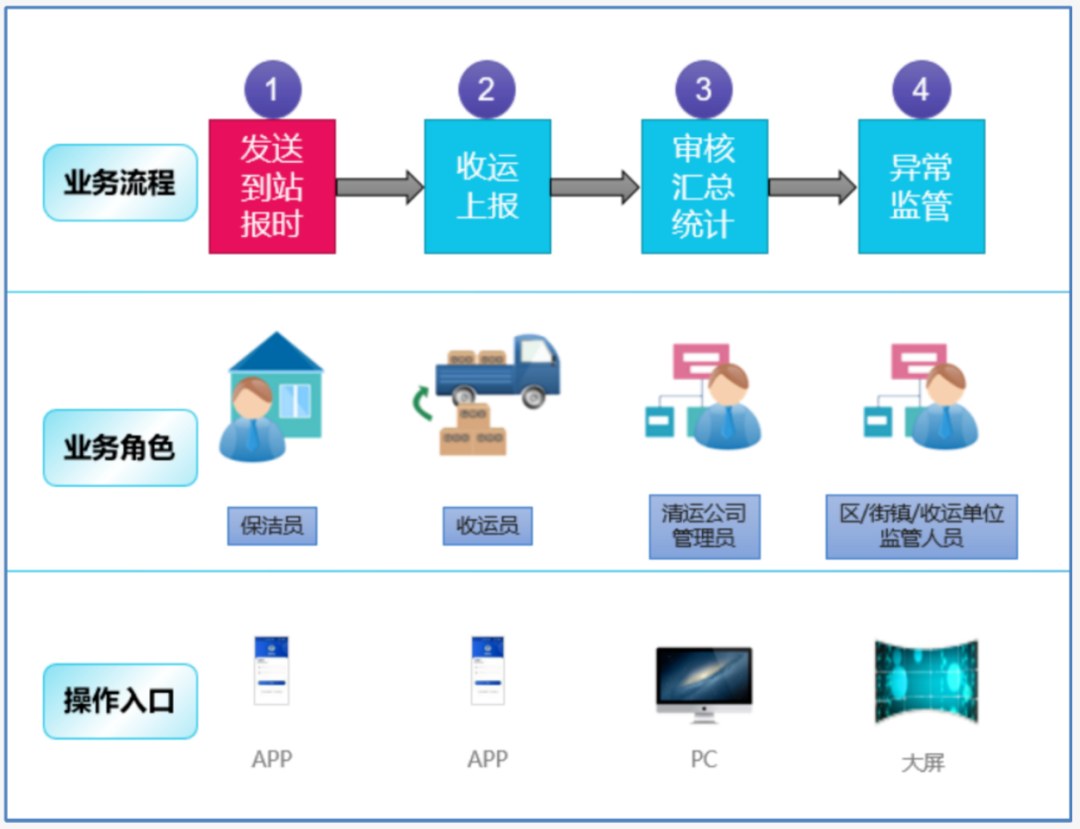 流程主要包括四個環節:發送到站報時、收運上報、審核彙總統計、異常管理