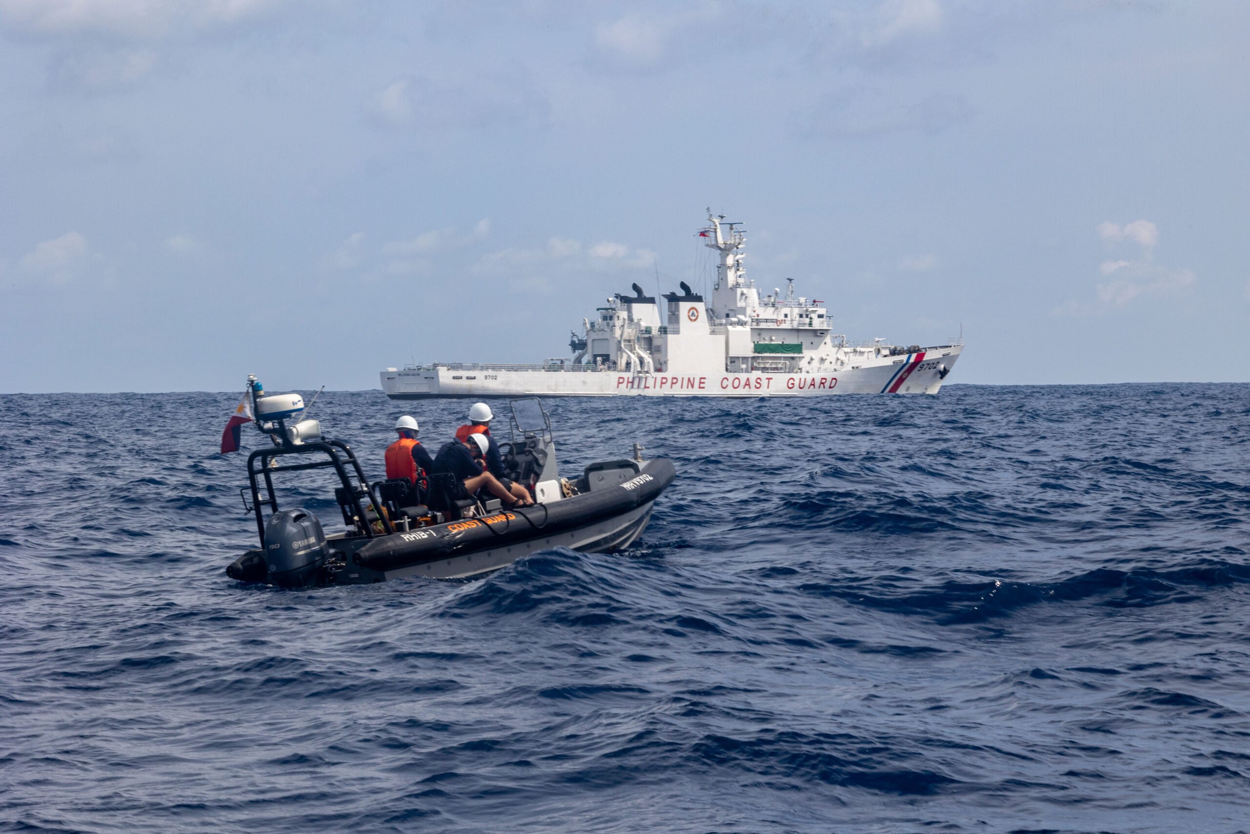 2024年7月16日,在南中國海舉行的美菲雙邊搜救演習中,菲律賓海岸警衞隊“梅爾喬拉·阿基諾”號(MRRV-9702)上的隊員駕駛小船進行演練。美國海軍陸戰隊照片