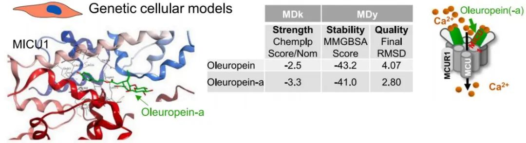 橄欖苦苷上有兩個特殊集團——羥基酪醇和欖酸,就像拼圖上的兩個凹槽一樣,正好能和線粒體鈣離子通道MCU上的兩塊重點區域嚴絲合縫地契合在一起。所以,橄欖苦苷能彌補被年齡悄悄削減的MCUR1,強行激活MCU通道,讓鈣離子得以自由進入、大展拳腳。