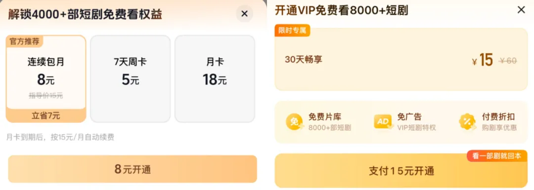 當然,隨着時間的推移,在IAP模式(用户在應用程序內部直接購買虛擬商品或服務)之外,也出現了一批如紅果短劇這樣藉着IAA模式(對用户免費,通過廣告變現)爭奪市場的入局者。而眼下,短視頻平台方同樣不甘寂寞,它們在全集付費高價和看廣告免費之間,給了短劇用户第三種選擇:開通會員。