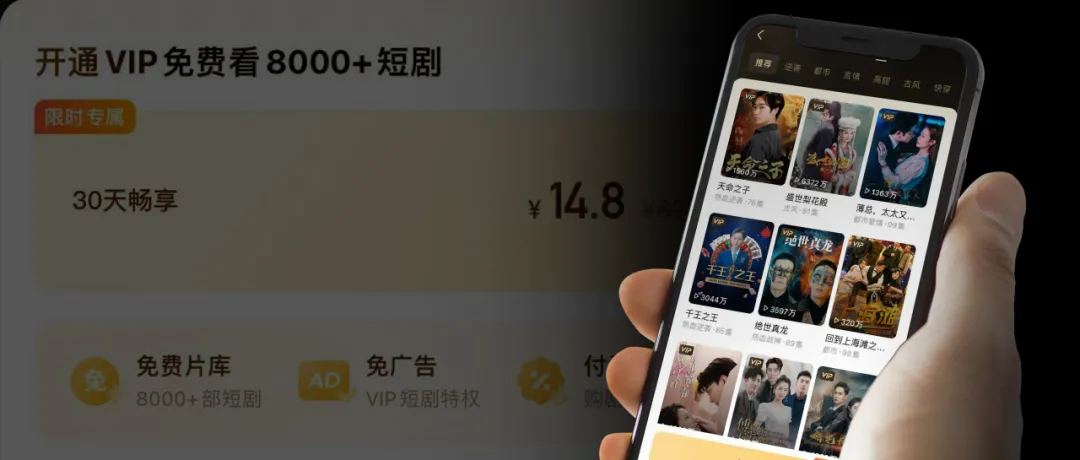具體來看,快手短劇VIP號稱“看一部劇就回本”,花15元暢享30天,開通即可免費看超8000部短劇。