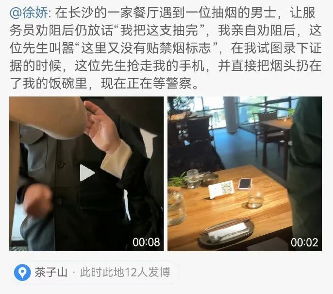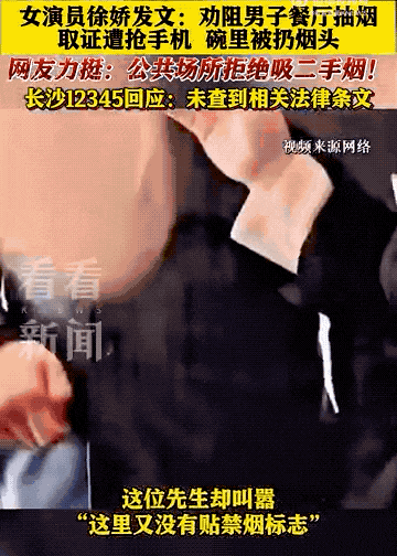 徐嬌勸阻男子餐廳抽煙,取證時被搶手機,飯碗裏被扔煙頭!_風聞