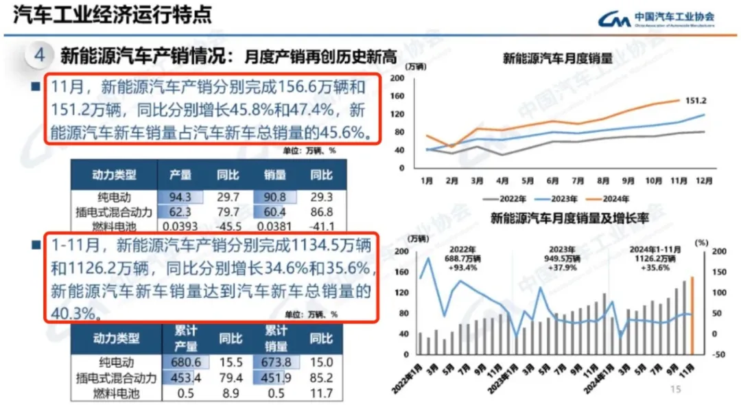 2024年中國新能源汽車產業繼續高歌猛進。數據統計,前11個月國內新能源汽車產銷分別完成1134.5萬輛和1126.2萬輛,同比分別增長34.6%和35.6%。