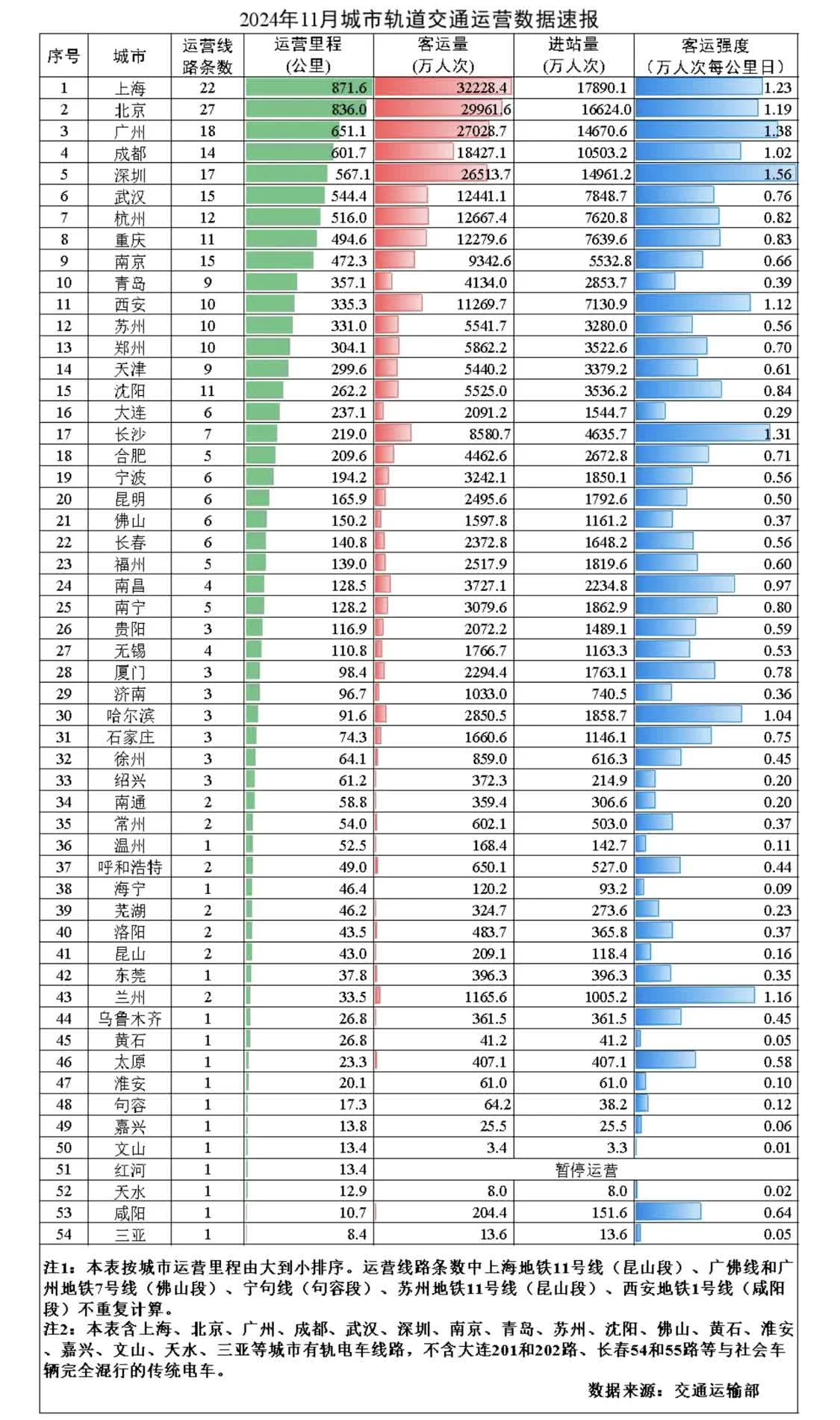根據交通運輸部《2024年11月城市軌道交通運營數據速報》,31個省(自治區、直轄市)和新疆生產建設兵團共有54個城市開通運營城市軌道交通線路313條,運營里程10522.1公里,完成客運量27.1億人次。11月份全國總運營里程的平均客運強度為0.860萬人次每公里日,同比增長1.9%。