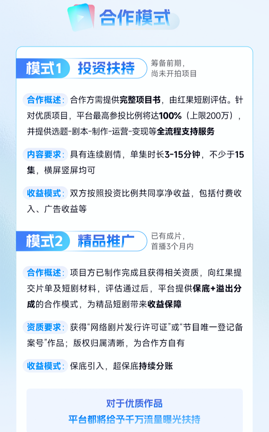 對創作者而言,平台提供的“最高100%投資支持”以及“千萬級流量扶持”無疑具有極強的吸引力。能夠同時提供資金支持和流量保障的模式,正在形成對傳統影視行業的創作資源虹吸效應。