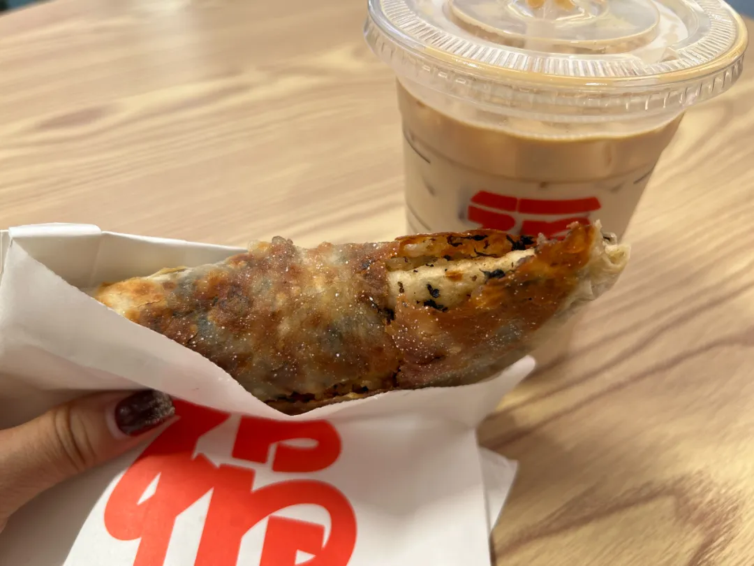 在漢福山店裏,沒有咖啡+常見的貝果、麪包,反而是大肉包子、肉餅、梅乾菜燒餅這樣的“老式早餐”。