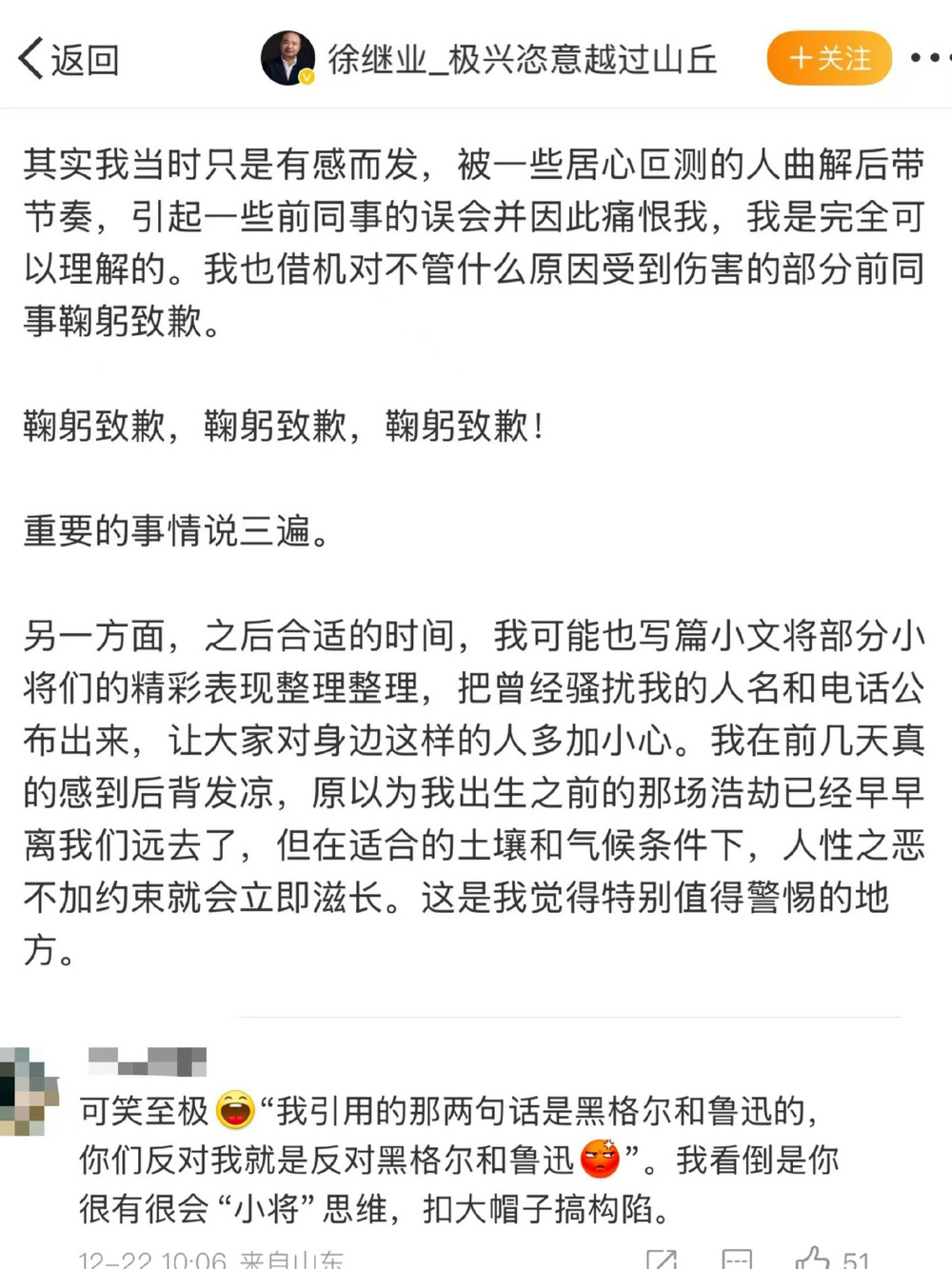 緊接着,在12月22日,徐繼業再次發文,就之前在朋友圈中對同事使用“僕從、蒼蠅”等負面詞彙表達了歉意,還提到這兩句話其一是出自黑格爾在《精神現象學》中引用的一句法國諺語,其二是出自魯迅的雜文《戰士和蒼蠅》。