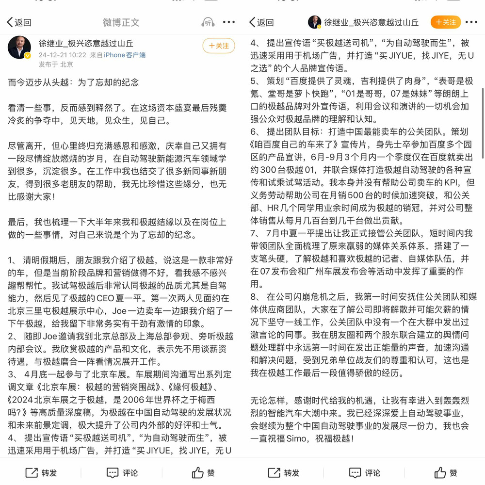 但12月21日,徐繼業在微博發佈了文章,確認了已從極越離職,長篇大論講述了自己為何到極越工作,也回顧了自己在極越期間一系列業績和貢獻
