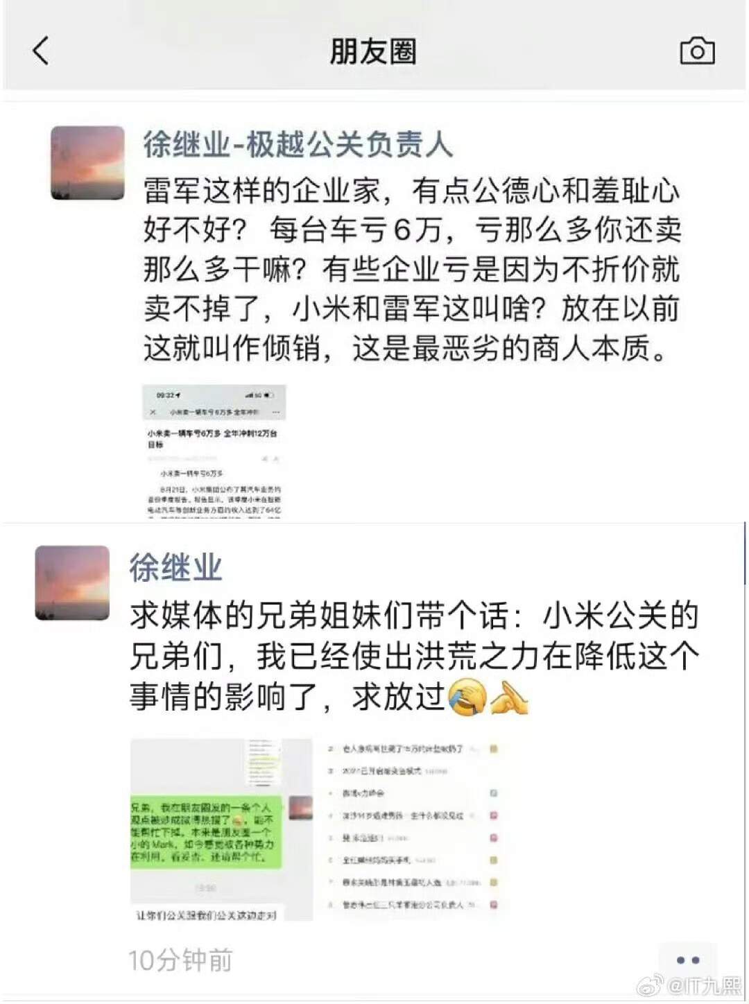 今年8月,徐繼業在朋友圈點名雷軍,讓其“有點公德心和羞恥心好不好”,意為雷軍把新能源車的價格打下來了,導致有些企業不虧就賣不掉了,還給小米扣上了“傾銷”的帽子,表示這是最惡劣的商人本質。
