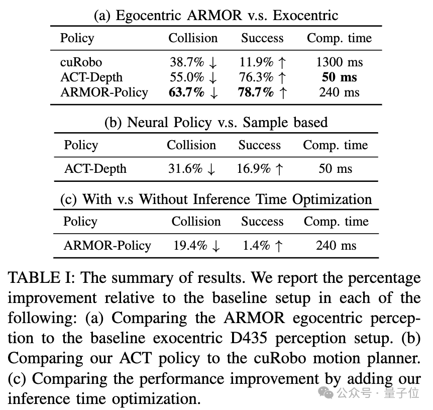 實驗結果顯示,與使用四個頭戴式和外部安裝的深度相機(外心感知)相比,ARMOR系統使碰撞降低了63.7%!