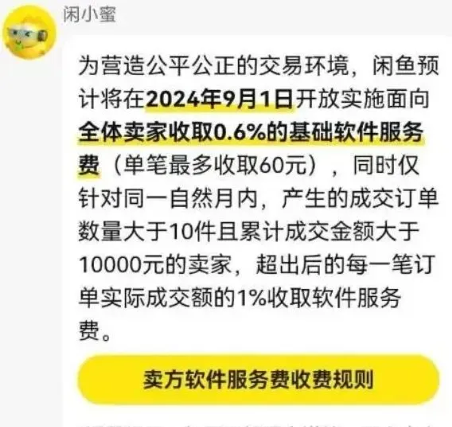緊接着的2024年6月,閒魚又宣佈了一項重要變革:自9月1日起,將面向全體賣家收取0.6%的基礎軟件服務費,單筆最高不超過60元。
