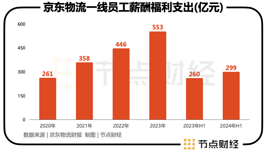 財報披露,2024年前上半年,京東物流一線員工薪酬福利支出達299億元,較上年同期增加44.6億元,增幅14.9%。2020年至2023年,京東物流一線員工薪酬福利支出累計約1620億元。
