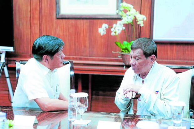 資料圖:當地時間2023年8月3日,菲律賓總統馬科斯(左)與前總統杜特爾特會談,就杜特爾特同年7月訪華一事進行討論。(圖源:菲律賓總統府)