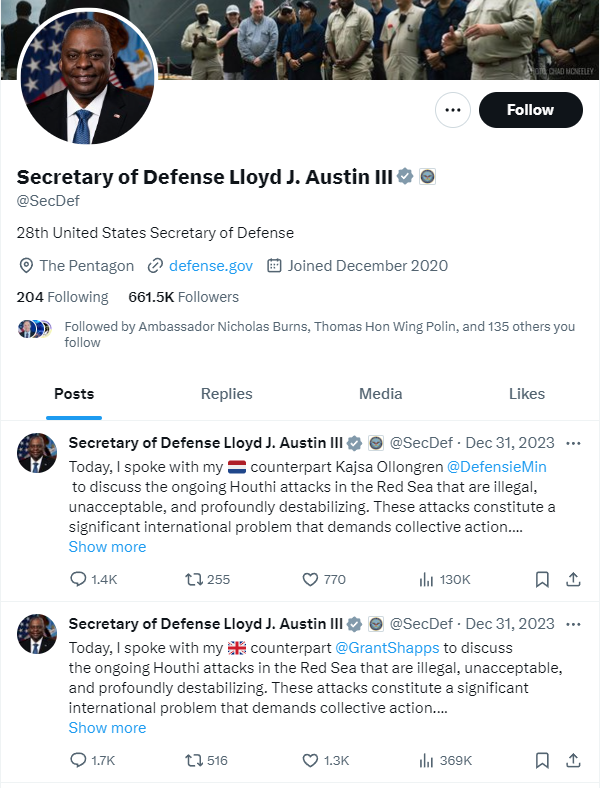 美國國防部長奧斯汀的社交媒體X賬號,自2023年12月31日後至今未更新