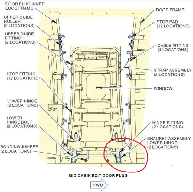 737MAX9門塞結構圖,紅圈部分為美聯航發現螺栓鬆動的位置