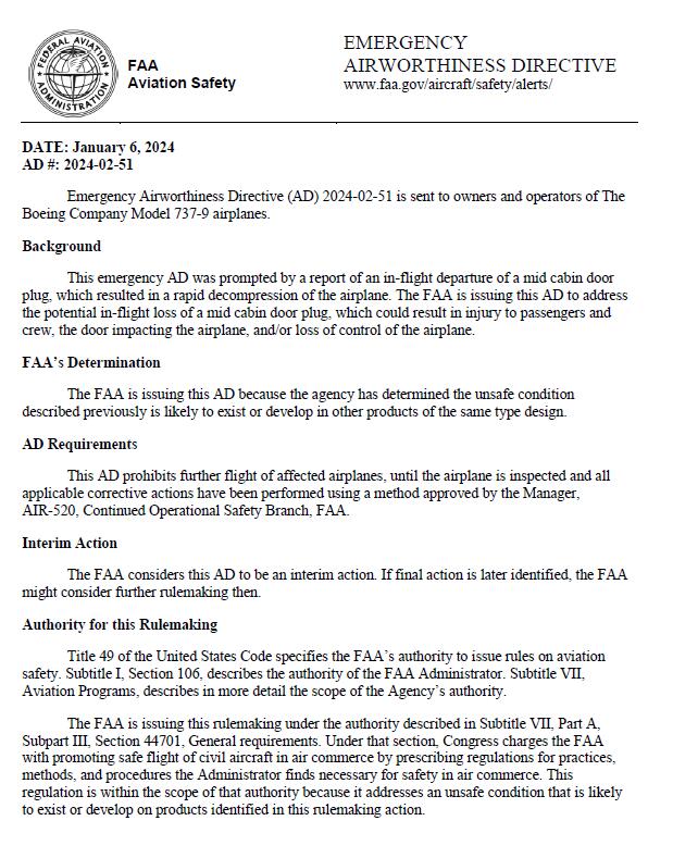 美國聯邦航空局立即發佈了緊急適航指令,要求每一架737MAX9都要檢查門塞位置才能飛行