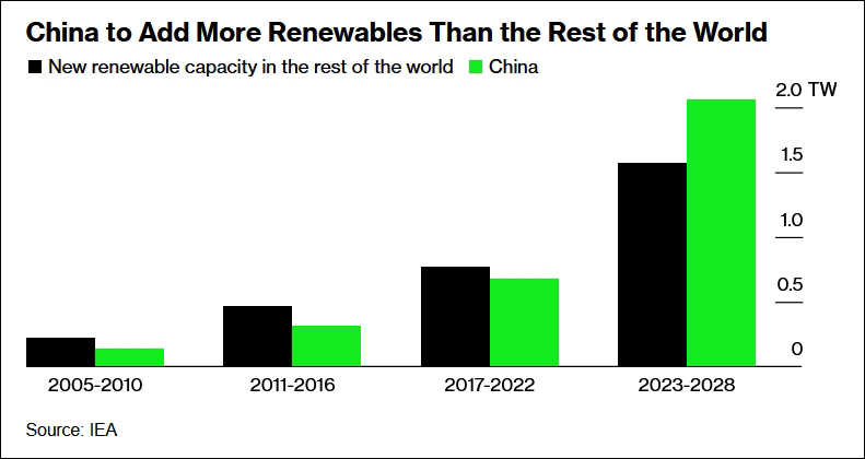 上圖為IEA預計的可再生能源發電增長趨勢,下圖顯示中國在2023年至2028年所貢獻的增長將多於世界其他國家。製圖:彭博社