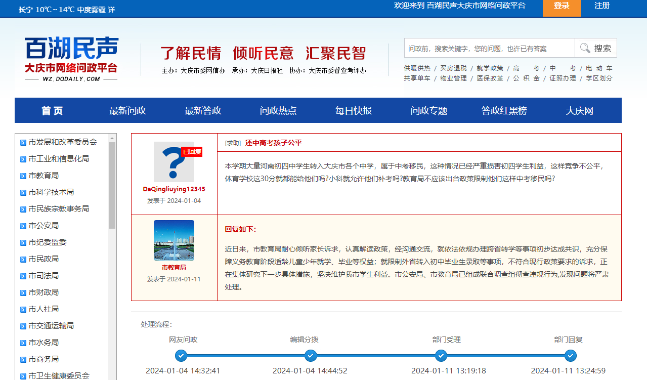 就此,大慶市教育局於1月11日回覆稱:“近日來,市教育局耐心傾聽家長訴求,認真解讀政策,經溝通交流,就依法依規辦理跨省轉學等事項初步達成共識,充分保障義務教育階段適齡兒童少年就學、畢業等權益;就限制外省轉入初中畢業生錄取等事項,不符合現行政策要求的訴求,正在集體研究下一步具體措施,堅決維護我市學生利益。市公安局、市教育局已組成聯合調查組徹查違規行為,發現問題將嚴肅處理。”