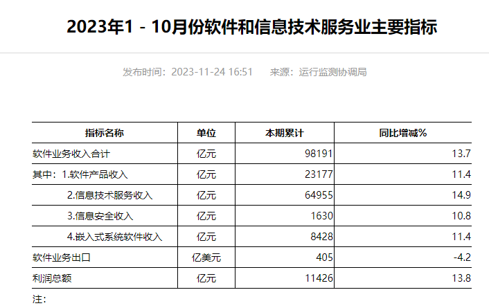 據工業和信息化部的統計數據,1-10月份,我國軟件和信息服務業務收入98191億元,同比增長13.7%;利潤總額11426億元,同比增長13.8%。整個行業的增長率要遠高於同期GDP的增長率。
