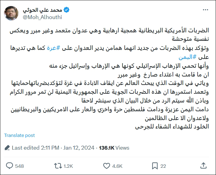 拜登11日稱,如有必要,美國將採取進一步措施。對此,胡塞武裝負責對外事務的高級官員侯賽因·伊齊12日警告,美國和英國將為這種“公然侵略付出沉重的代價”。此前一天,也門胡塞武裝領導人阿卜杜勒·馬利克·胡塞曾表示,美國針對胡塞武裝發動的每次襲擊都會得到回應,且未來胡塞武裝的反擊將更為猛烈。