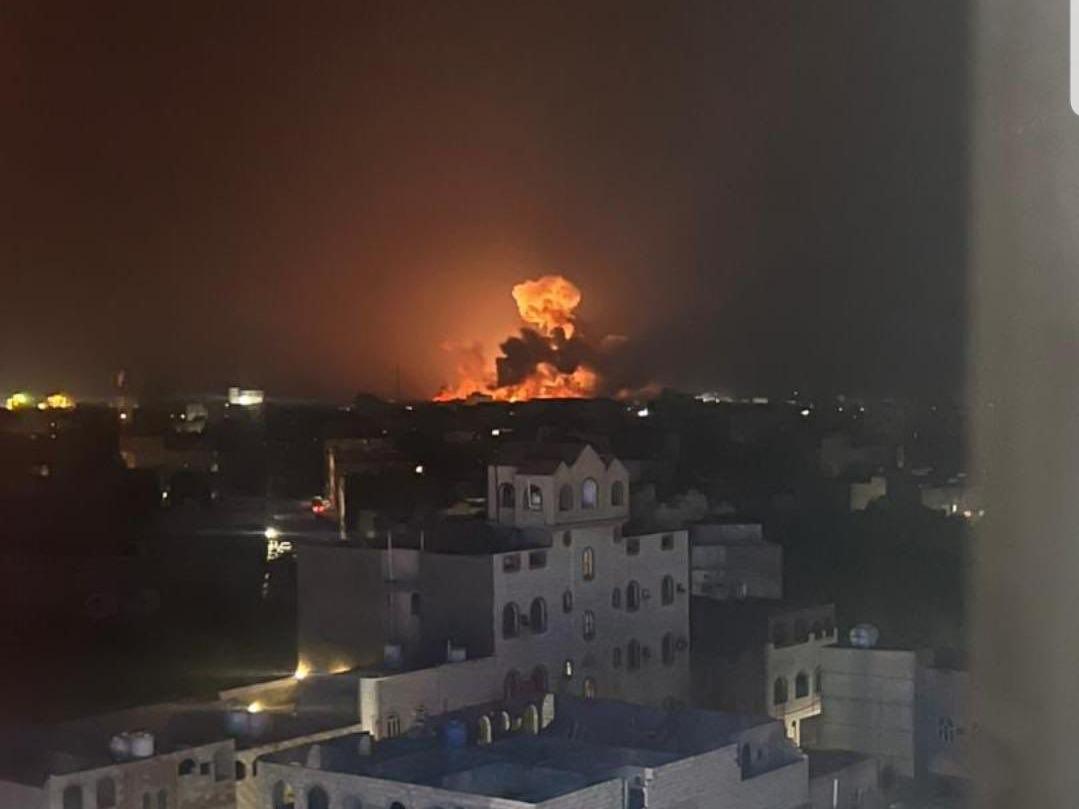 當地時間1月12日凌晨,在也門首都薩那拍攝的空襲畫面 圖源:新華社