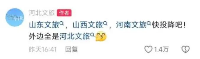 1月12日,“河北文旅”改名成功後揚言要當“卷王”,狂發了75條內容,並稱“山河四省互不內卷條約結束”,相關話題登上各平台熱榜。