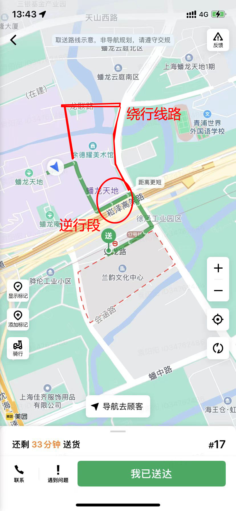 “途經滬青平公路時,平台也愛規劃逆行路線。”陳陽陽提供的第3條逆行路線正屬於這一情況。這是從京華路187弄送往南山雨果小區的一單,平台規劃的路線中,指示騎手從明珠路右拐進入滬青平公路向西騎行至葉聯路再向南。可是,滬青平公路在葉聯路路口處沒有過街橫道線,此時,平台索性規劃騎手沿着滬青平公路南側逆向騎行。1月8日,記者實地走了一遍這段路線:若騎手沿着滬青平公路北側騎行,需一直向西騎到徐盈路才能過街,再沿着滬青平公路南側向東抵達葉聯路。手機顯示,繞行路線比美團平台規劃路線遠了1.2公里。