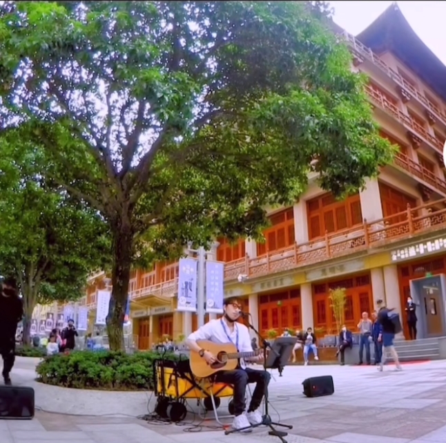 也是在街演中,小廖在彈唱一首歌曲,身側忽然伸出一隻手幫他翻了曲譜。一位女生站在他身旁邊聽邊看他的曲譜,在唱到差不多該翻頁時,女生為給小廖省事便直接幫他翻了。