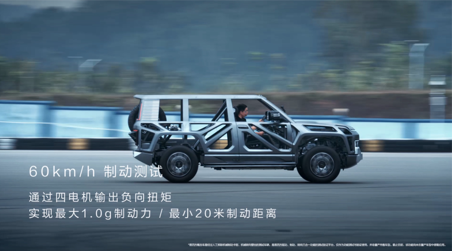 在比亞迪總部展示的這台拆掉剎車、拆掉轉向柱的仰望 U8 概念車,依舊可以實現最大 1 G 的制動減速度,可以擁有 40 米的零百剎停距離。在 60 km/h - 0 km/h 的測試中,這台概念車甚至可以將剎車距離控制在 20 米內。