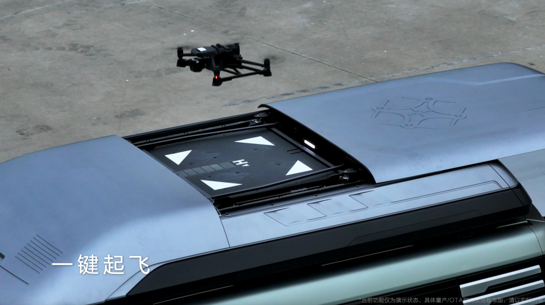 在座艙領域的創新,比亞迪同樣帶來了讓人眼前一亮的方案——仰望 U8 和大疆強強聯手,車頂配備了一個無人機的「機場」。