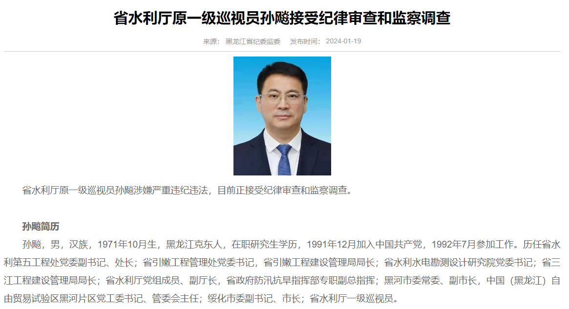 據黑龍江省紀委監委網站1月19日消息,省水利廳原一級巡視員孫飈涉嫌嚴重違紀違法,目前正接受審查調查。