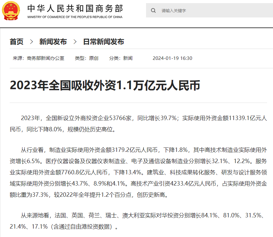 商務部:2023年全國吸收外資1.1萬億元人民幣