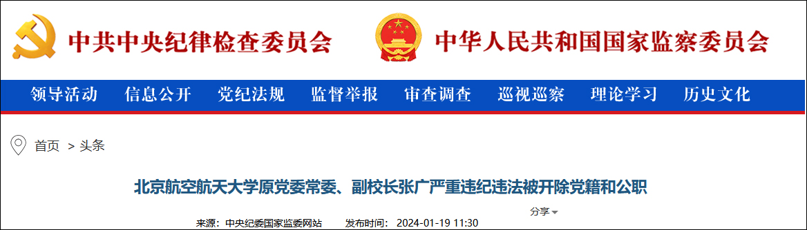 據中央紀委國家監委網站1月19日消息,經中共中央批准,中央紀委國家監委對北京航空航天大學原黨委常委、副校長張廣嚴重違紀違法問題進行了立案審查調查。