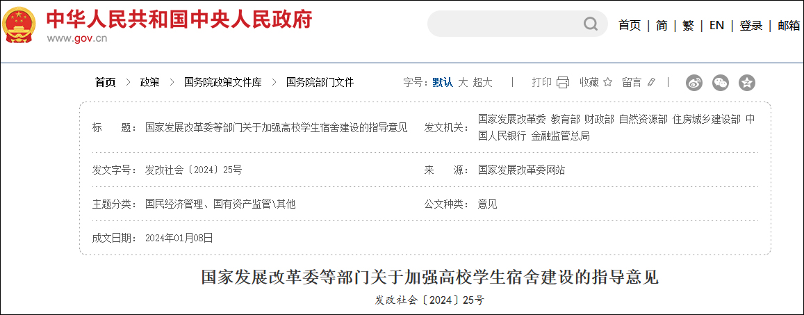 據國家發展改革委網站1月18日消息,為貫徹落實黨的二十大精神和黨中央、國務院決策部署,加快推進高校學生宿舍建設,增加高校學生宿舍供給,提升宿舍環境,豐富宿舍功能,更好滿足高校學生在校學習生活需要,近日,國家發展改革委、教育部等7部門聯合印發《關於加強高校學生宿舍建設的指導意見》(以下簡稱《指導意見》)。