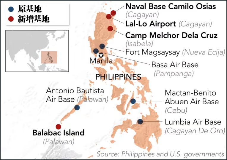 菲律賓原美軍基地與去年新設美軍基地對比圖(圖源:《日經亞洲》)