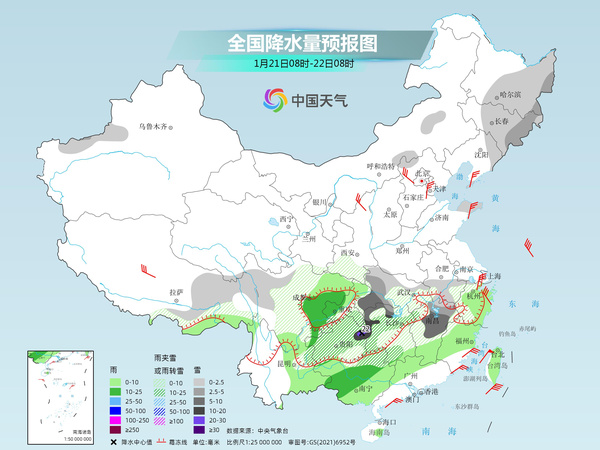 預計1月22日08時至1月23日08時,湖南南部、江西中南部、福建西部、廣西東北部、廣東北部等地的部分地區有大雪(5~9毫米)。上述部分地區新增積雪深度2~6釐米,局地可達8釐米以上。