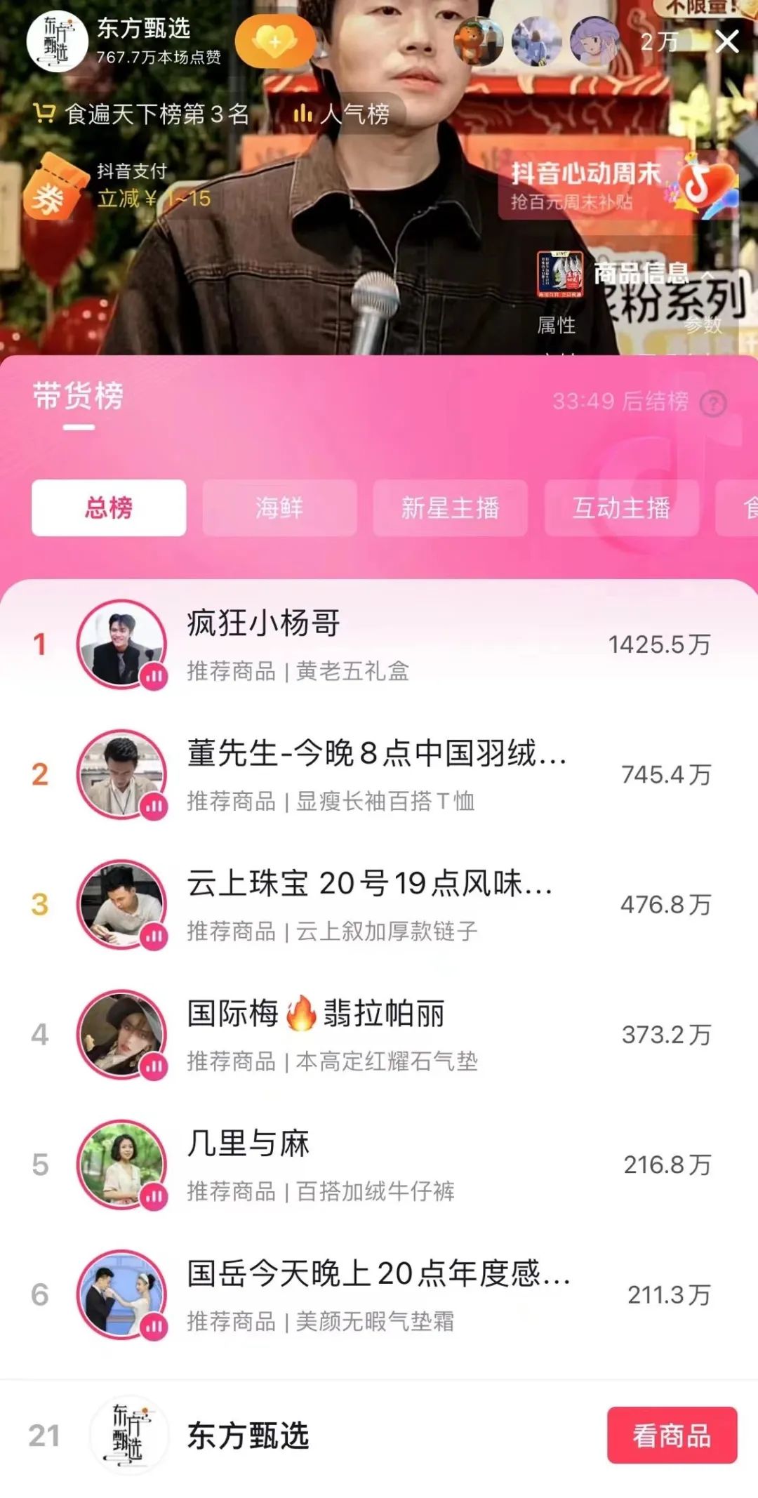 截至20日23時,東方甄選抖音粉絲數為3123.6萬,與輝同行抖音粉絲數為1298.6萬。“與輝同行”抖音直播間位列帶貨總榜第9名,同在直播的“東方甄選”則位列帶貨總榜第21名,居於“與輝同行”之後。