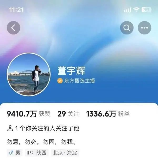在此之前,董宇輝抖音賬號認證為“東方甄選主播”,簽名為“勿意,勿必,勿固,勿我”。更早之前,董宇輝賬號的簽名則為“曾經是老師,現在是售貨員”。